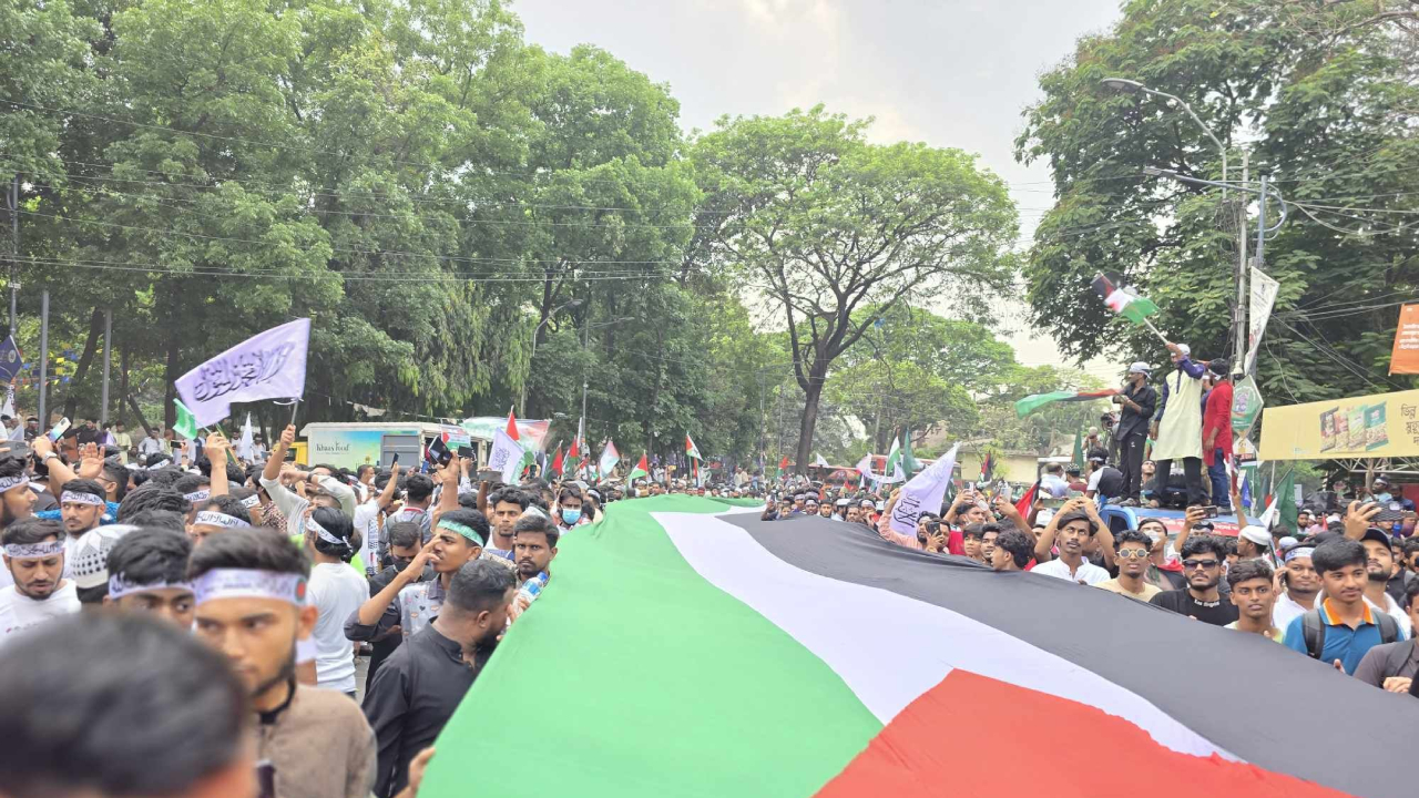 বিশ্বজুড়ে যখন ফিলিস্তিনের পাশে দাঁড়িয়ে প্রতিবাদ-সমাবেশ হচ্ছে, তখন বাংলাদেশেও ‘প্যালেস্টাইন সলিডারিটি মুভমেন্ট বাংলাদেশ’ ব্যানারে আয়োজিত হয়েছে এই ব্যতিক্রমধর্মী সমাবেশ।