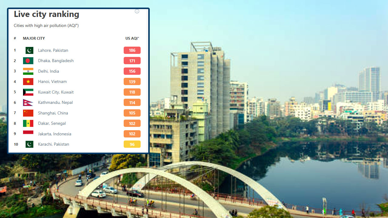 অপরদিকে ১৮৬ স্কোর নিয়ে আজ দূষিত বায়ুর শহরগুলোর মধ্যে শীর্ষ স্থানে রয়েছে পাকিস্তানের লাহোর। ১৫৬ স্কোর নিয়ে তৃতীয় অবস্থানে আছে দিল্লি, চতুর্থ অবস্থানে ভিয়েতনামের হ্যানয় (১৩৯), তালিকায় পঞ্চম ও ষষ্ঠ স্থানে আছে কুয়েত (১১৮) ও নেপালের কাঠমান্ডু (১১৪)।
