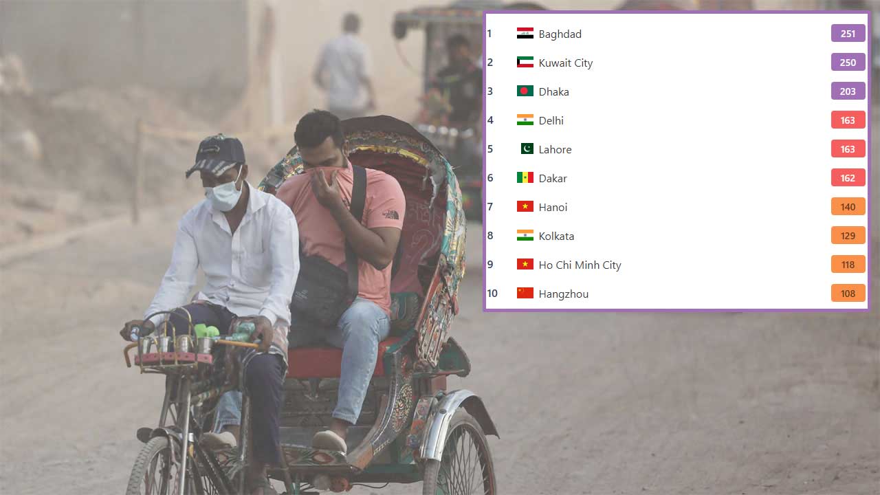 আইকিউএয়ারের দেওয়া তথ্যে দেখা যায়, দূষিত শহরের শীর্ষে থাকা বাগদাদের স্কোর ২৫১, দ্বিতীয় অবস্থানে থাকা কুয়েত সিটির স্কোর ২৫০। ঢাকার পরে চতুর্থ স্থানে থাকা দিল্লির স্কোর ১৬৩। পঞ্চম স্থানে রয়েছে লাহোর, স্কোর ১৬৩। আর ১২৯ স্কোর নিয়ে অষ্টম স্থানে রয়েছে কলকাতা।