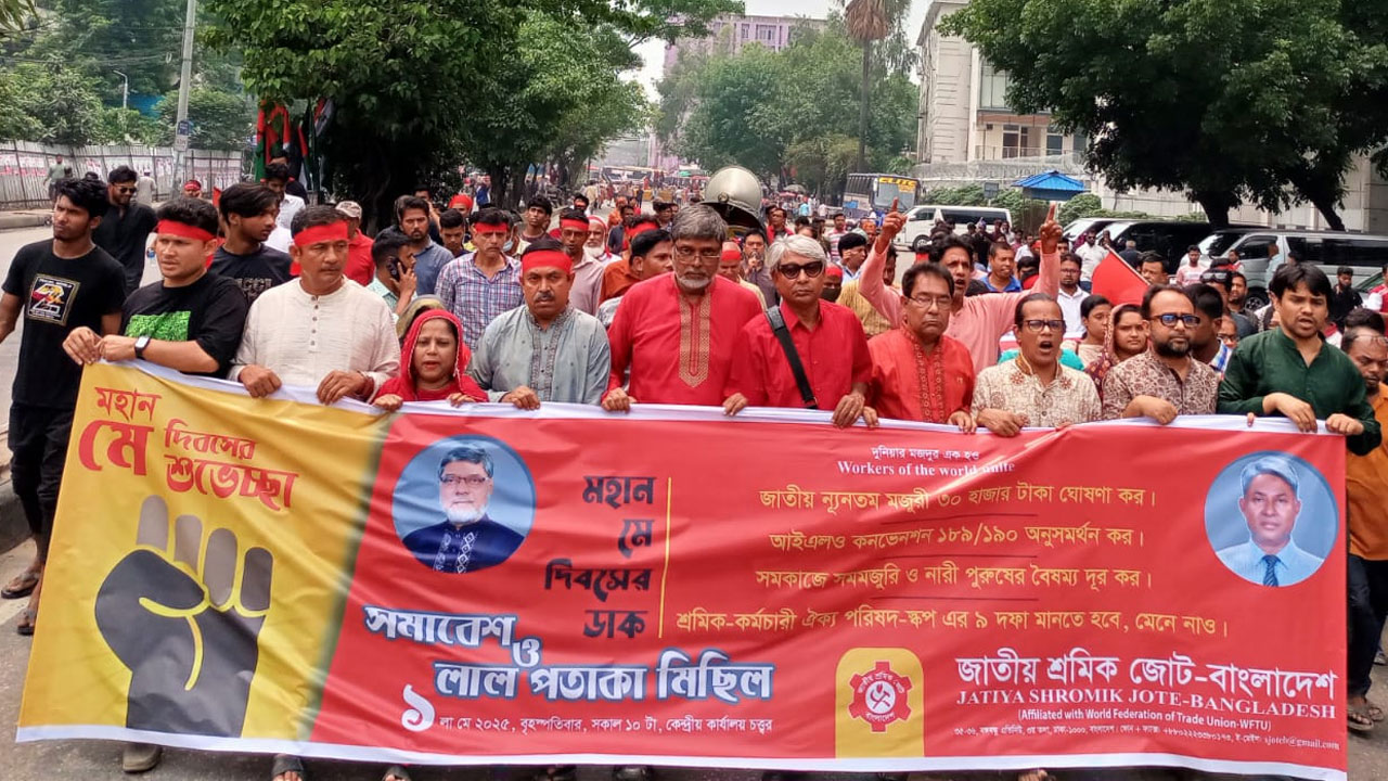 বক্তারা বলেন, ন্যূনতম জাতীয় মজুরি ঘোষণা ও বাস্তবায়ন, সব ক্ষেত্রে ট্রেড ইউনিয়ন অধিকার নিশ্চিত করা, শ্রমিক-কর্মচারীদের চাকুরি ও কাজের নিশ্চয়তা ও নিরাপত্তার দাবিতে কারখানা-অঞ্চল-জাতীয় ভিত্তিতে শ্রমিক-কর্মচারীদের ঐক্যবদ্ধ হবার আহ্বান জানান।