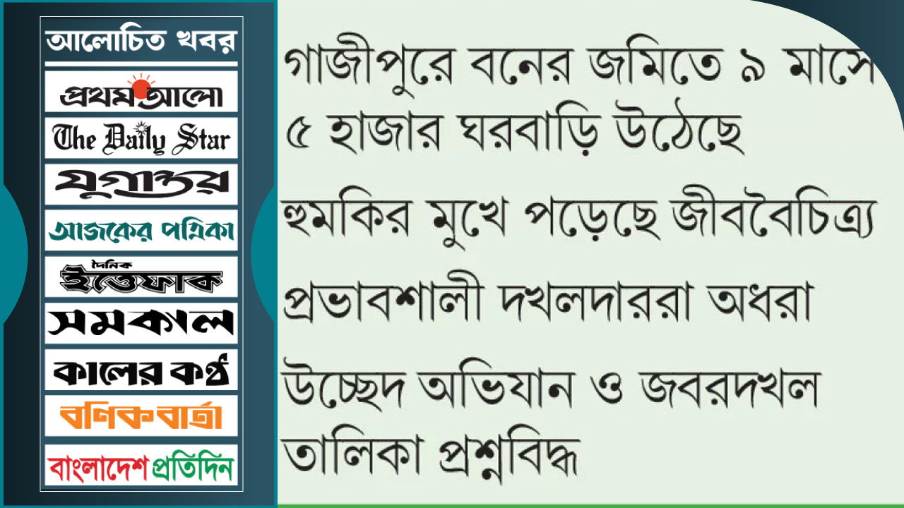 গাজীপুরে গত নয় মাসে শালবন দখল করে পাঁচ হাজারের বেশি বাড়িঘর, দোকানপাটসহ বিভিন্ন ধরনের স্থাপনা গড়ে উঠেছে। স্থাপনাগুলোর মধ্যে টিনশেড, আধাপাকা ও বহুতল ভবনও রয়েছে। গত বছর গণঅভ্যুত্থানপরবর্তী আইনশৃঙ্খলা পরিস্থিতির অবনতি হলে বনের জমি দখল শুরু করে এক শ্রেণির ভূমিদস্যু। গত নয় মাসে আইনশৃঙ্খলা পরিস্থিতির কিছুটা উন্নতি হলেও থেমে নেই বনভূমি জবরদখল। অব্যাহত দখলের কারণে ভাওয়াল বনখ্যাত শালবনের আয়তন ক্রমশ ছোট হয়ে আসছে। এতে হুমকির মুখে পড়েছে জীববৈচিত্র্য, বাস্তুচ্যুত হচ্ছে বন্যপ্রাণী।