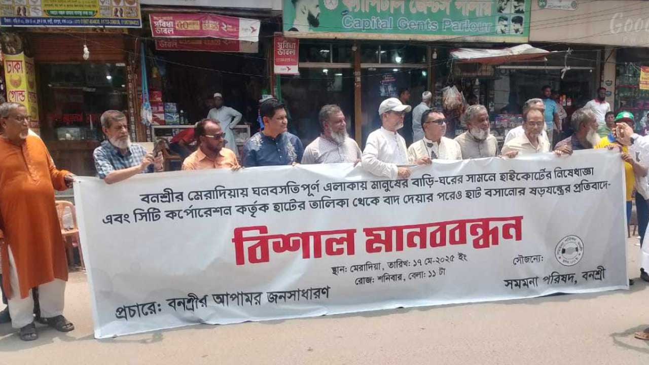 মানববন্ধনে বনশ্রীর সমমনা পরিষদের সভাপতি শাহাবুদ্দিন শিকদার বলেন, বনশ্রীর মেরাদিয়া একটি ঘনবসতিপূর্ণ আবাসিক এলাকা। আদালতের নিষেধাজ্ঞা এবং সিটি কর্পোরেশনের হাট তালিকা থেকে বাদ দেওয়ার পরেও গরুর হাট বসানোর ষড়যন্ত্র চলছে। এই ষড়যন্ত্রের প্রতিবাদেই আমরা এখানে দাঁড়িয়েছি।