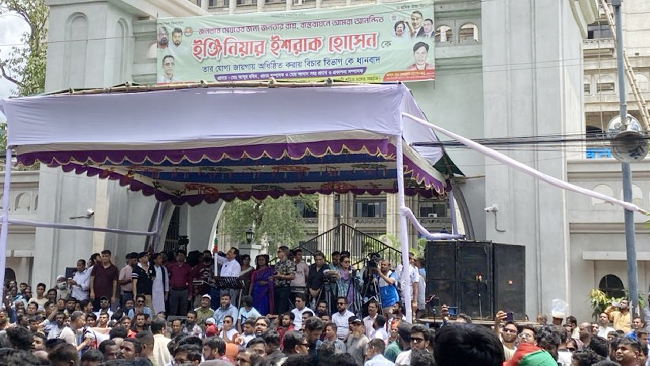 এ দিন সকাল থেকে নগর ভবনের সামনের সড়কে অবস্থান নিয়ে আন্দোলনকারীরা ইশরাককে মেয়র হিসেবে শপথ গ্রহণ করানোর পাশাপাশি স্থানীয় সরকার উপদেষ্টা আসিফ মাহমুদের পদত্যাগের দাবি জানান।