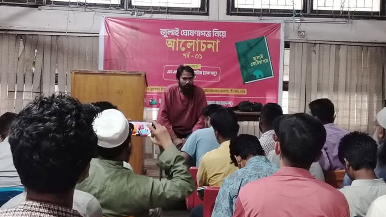 ‘জুলাই ঘোষণাপত্র ও আগামী দিনের রাজনৈতিক রূপরেখা’ শীর্ষক এই আলোচনা সভায় বক্তারা ২০২৩ সালের জুলাই মাসে উদ্ভূত অভ্যুত্থানসদৃশ গণজাগরণ ও এর রাজনৈতিক তাৎপর্য বিশ্লেষণ করেন। প্রধান আলোচকের বক্তব্যে এস এম রেজাউল করিম বলেন, “জুলাই অভ্যুত্থান ছিল নতুন এক রাজনৈতিক অভিজ্ঞতার সূচনা। কিন্তু দুর্ভাগ্যজনকভাবে, সে অভ্যুত্থানের অন্তর্নিহিত বার্তা, রাজনৈতিক দাবি ও ঐতিহাসিক শক্তিকে আমরা কাঠামোগতভাবে রূপ দিতে পারিনি।”