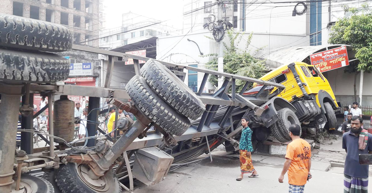 শাহজাদপুরে সুবাস্তু নজর ভ্যালির সামনে রডবোঝাই লরিটি উল্টে পড়ে আছে। ছবি : ঢাকা পোস্ট।