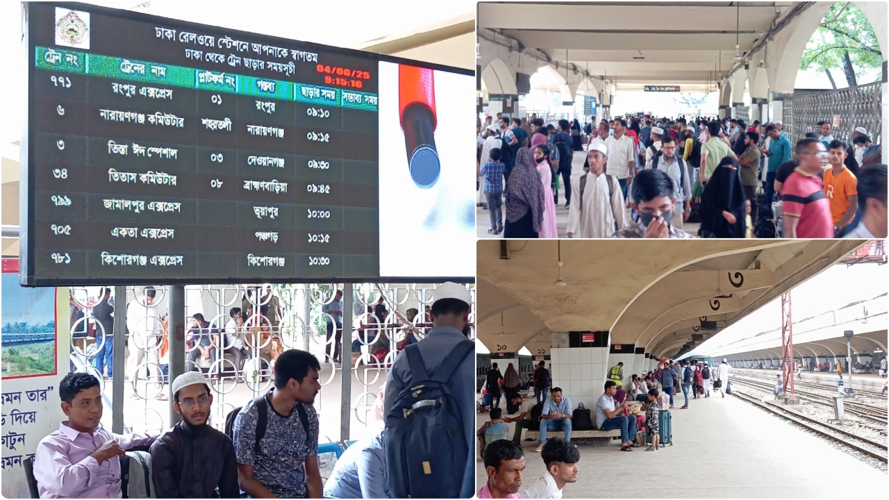 বুধবার (৪ জুন) সকালে ঢাকা রেলওয়ে স্টেশনে (কমলাপুর) গিয়ে দেখা যায়, প্ল্যাটফর্মগুলোর পাশে ও পিলারের আশপাশে অসংখ্য যাত্রী অপেক্ষা করছেন। তাদের অনেকের ট্রেন ছাড়ার সময় তখনও এক-দেড় ঘণ্টা বা তারও বেশি সময় বাকি।