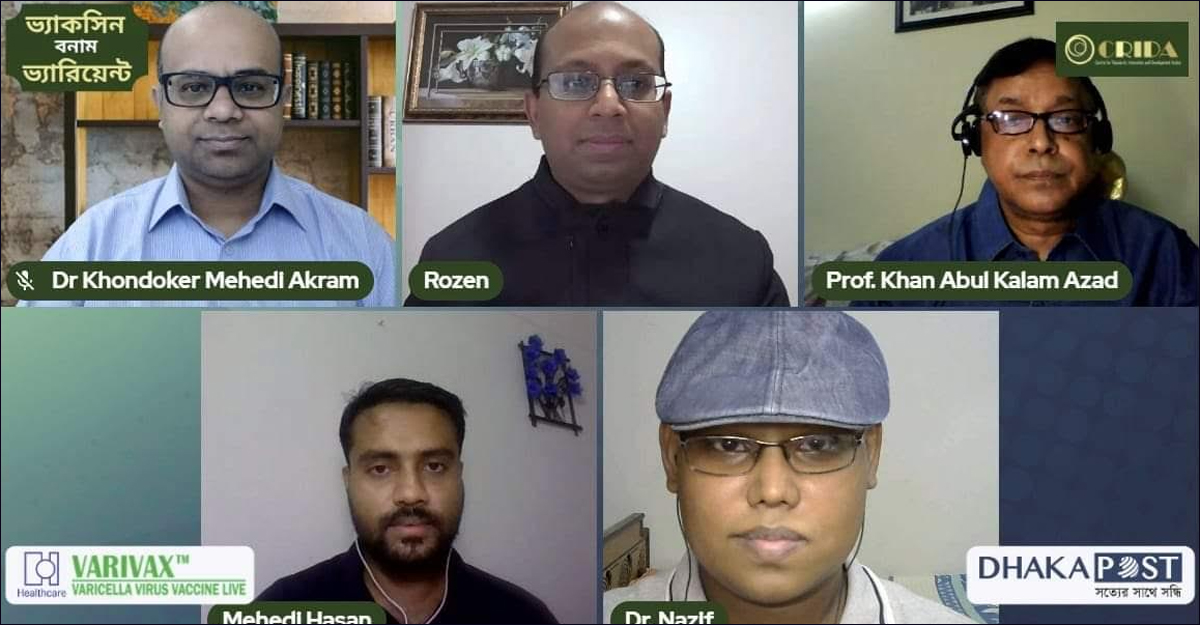 রোববার (৬ জুন) রাতে সেন্টার ফর রিসার্চ, ইনোভেশন অ্যান্ড ডেভেলপমেন্ট অ্যাকশন আয়োজিত ‘করোনার ভ্যাকসিন বনাম ভ্যারিয়েন্ট’ শীর্ষক সায়েন্টিফিক সেমিনারে আলোচকরা এ মতামত দেন। সেমিনারটির মিডিয়া পার্টনার হিসেবে ছিল অনলাইন নিউজপোর্টাল ঢাকা পোস্ট।