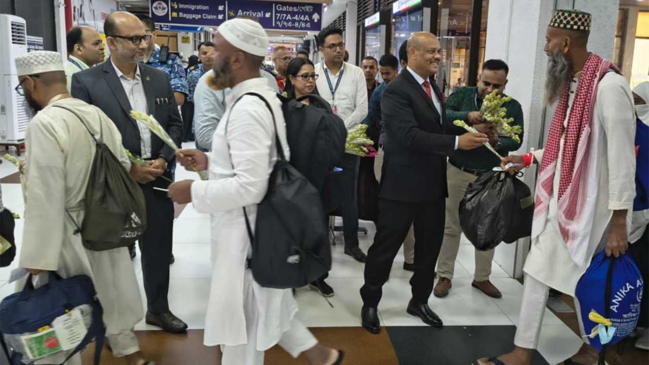 এসময় বিমানবন্দরের বোর্ডিং ব্রিজে হাজিদের স্বাগত জানান বেসামরিক বিমান চলাচল কর্তৃপক্ষের (বেবিচক) চেয়ারম্যান এয়ার ভাইস মার্শাল মো. মঞ্জুর কবীর ভূঁইয়া। তিনি ফুল দিয়ে প্রথম ফিরতি ফ্লাইটের হাজিদের বরণ করে নেন।