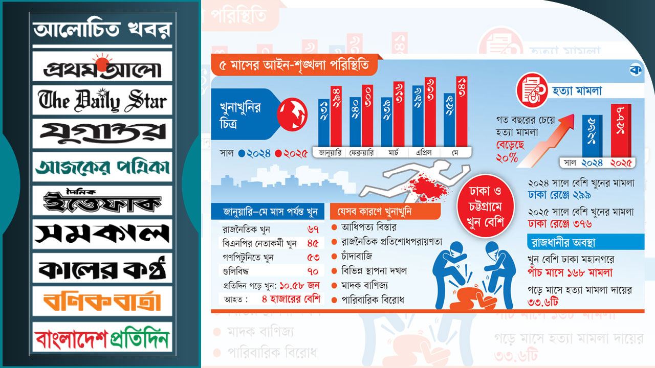 দেশে খুনাখুনি বেড়েই চলেছে। পুলিশ সদর দপ্তরের গত পাঁচ মাসের অপরাধসংক্রান্ত পরিসংখ্যান পর্যালোচনায় দেখা গেছে, চলতি বছরের জানুয়ারি থেকে মে পর্যন্ত পাঁচ মাসে দেশের বিভিন্ন থানায় এক হাজার ৫৮৭টি হত্যা মামলা করা হয়েছে। গত বছরের একই সময়ে হত্যা মামলা হয়েছিল এক হাজার ২৬৫টি। এই হিসাবে গত বছরের চেয়ে এ বছরের প্রথম পাঁচ মাসে ৩২২টি বেশি হত্যা মামলা করা হয়েছে।