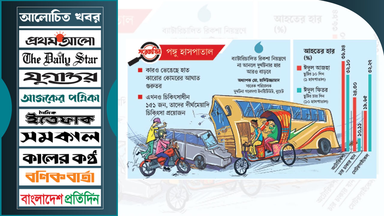 ঈদুল আজহার ছুটিতে সড়ক দুর্ঘটনায় আহত হয়ে যারা রাজধানীর জাতীয় অর্থোপেডিক হাসপাতাল ও পুনর্বাসন প্রতিষ্ঠানে (পঙ্গু হাসপাতাল) চিকিৎসা নিয়েছেন বা নিচ্ছেন, তাদের ৩৬ দশমিক ৮৪ শতাংশ ব্যাটারিচালিত রিকশা ও সিএনজিচালিত অটোরিকশায় আহত হয়েছেন। দুর্ঘটনায় কারও হাত ভেঙেছে, কারও কোমরের আঘাত গুরুতর। অনেকের স্থায়ী পঙ্গুত্বের আশঙ্কা রয়েছে। পঙ্গু হাসপাতালের রোগী নিবন্ধন খাতার তথ্য বিশ্লেষণ করে এ পরিসংখ্যান পাওয়া গেছে।
