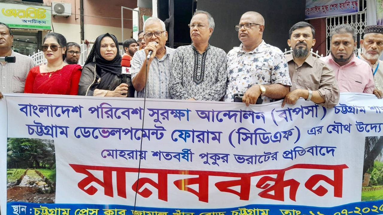 শনিবার (১৯ জুলাই) চট্টগ্রাম প্রেস ক্লাবে আয়োজিত এক মানববন্ধনে পরিবেশবিদরা পুকুর ভরাটের কারণে চট্টগ্রামের পরিবেশ বিপর্যস্ত হতে পারে বলে সতর্ক করেন।