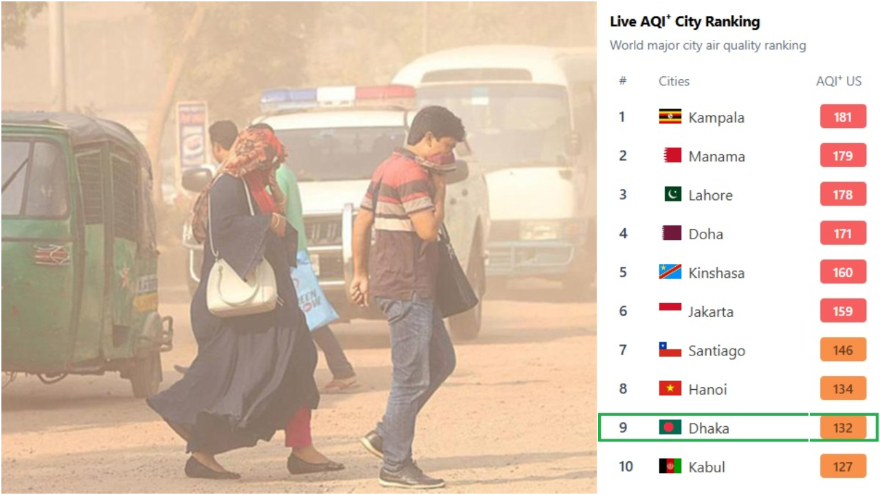 বিশ্বের দূষিত বায়ুর শহরের তালিকায় সোমবার (২৮ জুলাই) সকাল ১০টার আপডেটে ঢাকার বাতাসের মান ছিল ১৩২, যা সংবেদনশীল গোষ্ঠীর জন্য অস্বাস্থ্যকর বলে নির্দেশ করে। এতে বায়ুদূষণে বিশ্বের ১২৫ শহরের মধ্যে ৯ নম্বরে আছে ঢাকা।