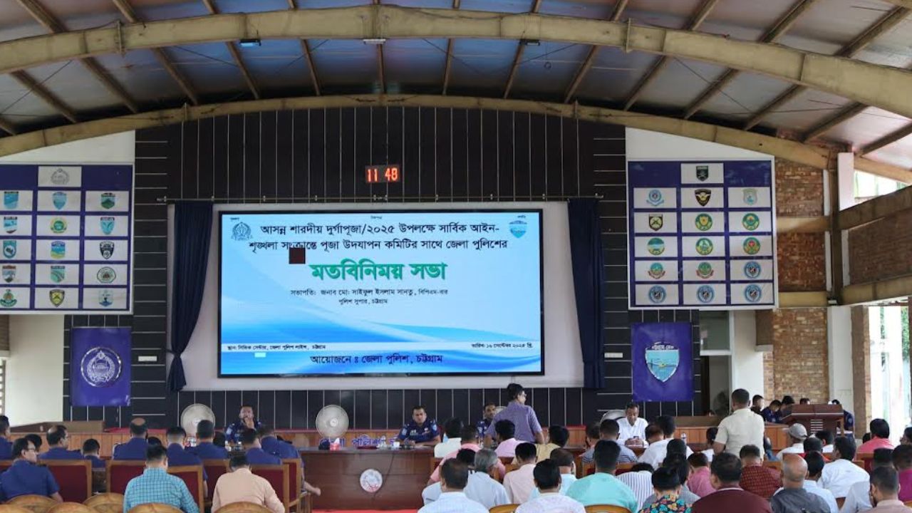 আসন্ন শারদীয় দুর্গাপূজা উপলক্ষ্যে মতবিনিময় সভা করেছে চট্টগ্রাম জেলা পুলিশ। মঙ্গলবার (১৬ সেপ্টেম্বর) জেলা পুলিশ লাইনসে এ সভার আয়োজন করা হয়।
