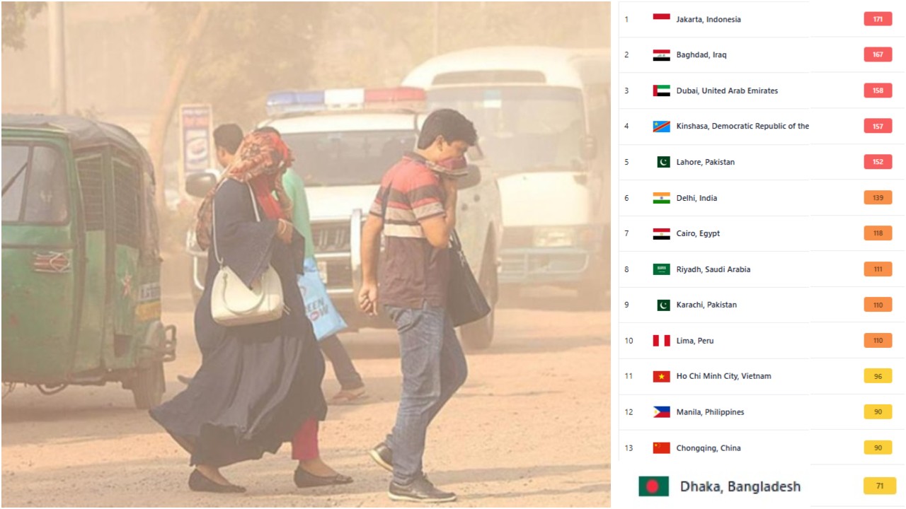 ১৭১ স্কোর নিয়ে আজ বায়ুদূষণে শীর্ষে রয়েছে ইন্দোনেশিয়ার রাজধানী জাকার্তা। ১৬৭ স্কোর নিয়ে দ্বিতীয় অবস্থানে আছে ইরাকের রাজধানী বাগদা, ১৫৮ স্কোর নিয়ে তৃতীয় অবস্থানে আছে সংযুক্ত আরব আমিরাত এবং ১৫৭ স্কোর নিয়ে চতুর্থ স্থানে রয়েছে গণতান্ত্রিক কঙ্গো প্রজাতন্ত্রের রাজধানী কিনশাসার।