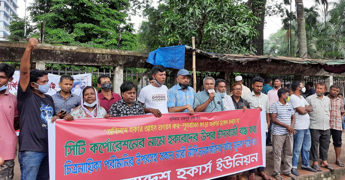 চাঁদাবাজদের গ্রেফতারের দাবিতে হকার্স ইউনিয়নের বিক্ষোভ