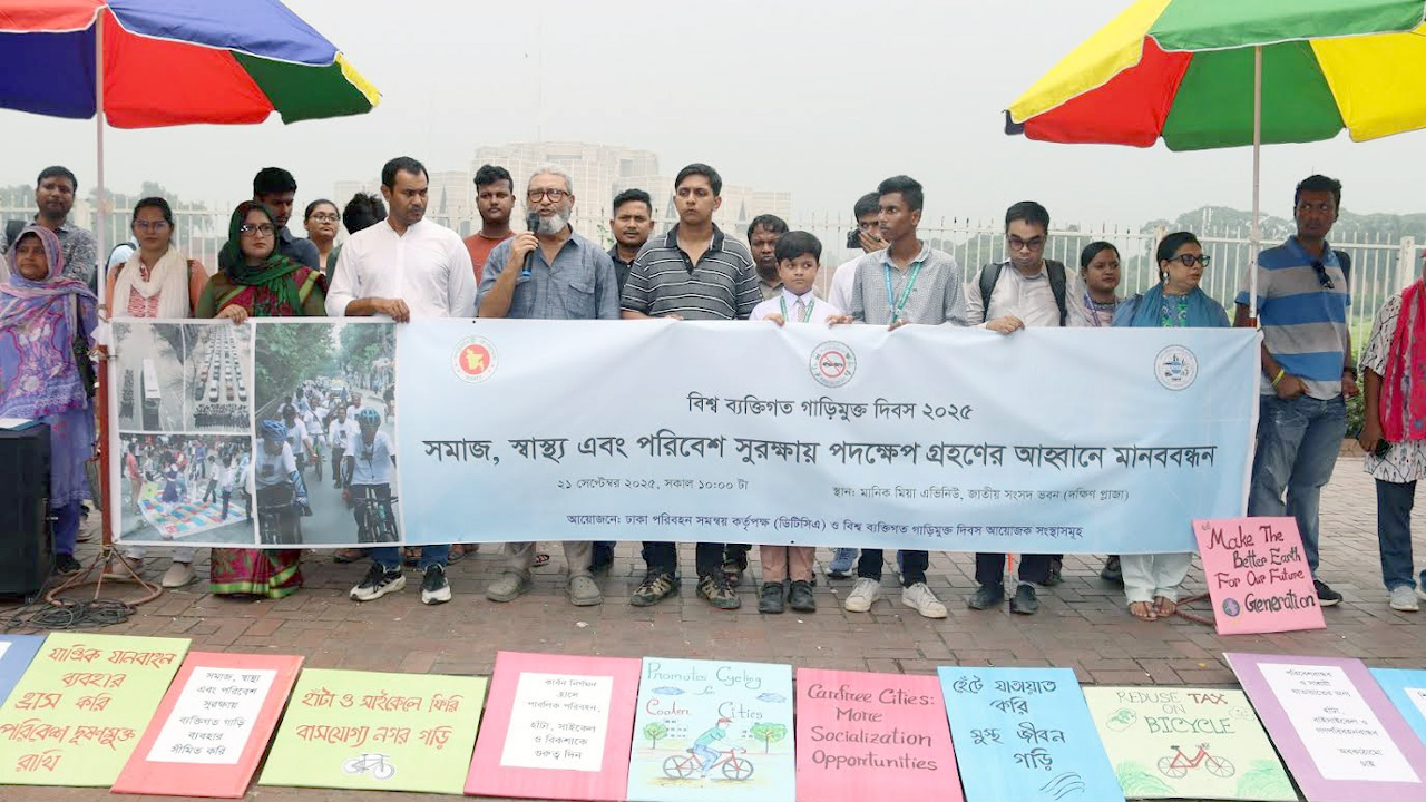 ‘বিশ্ব ব্যক্তিগত গাড়িমুক্ত দিবস ২০২৫’ উপলক্ষ্যে আয়োজিত মানববন্ধনে সমাজ, স্বাস্থ্য এবং পরিবেশ সুরক্ষায় পদক্ষেপ নেওয়ার আহ্বান জানিয়েছেন বক্তারা।