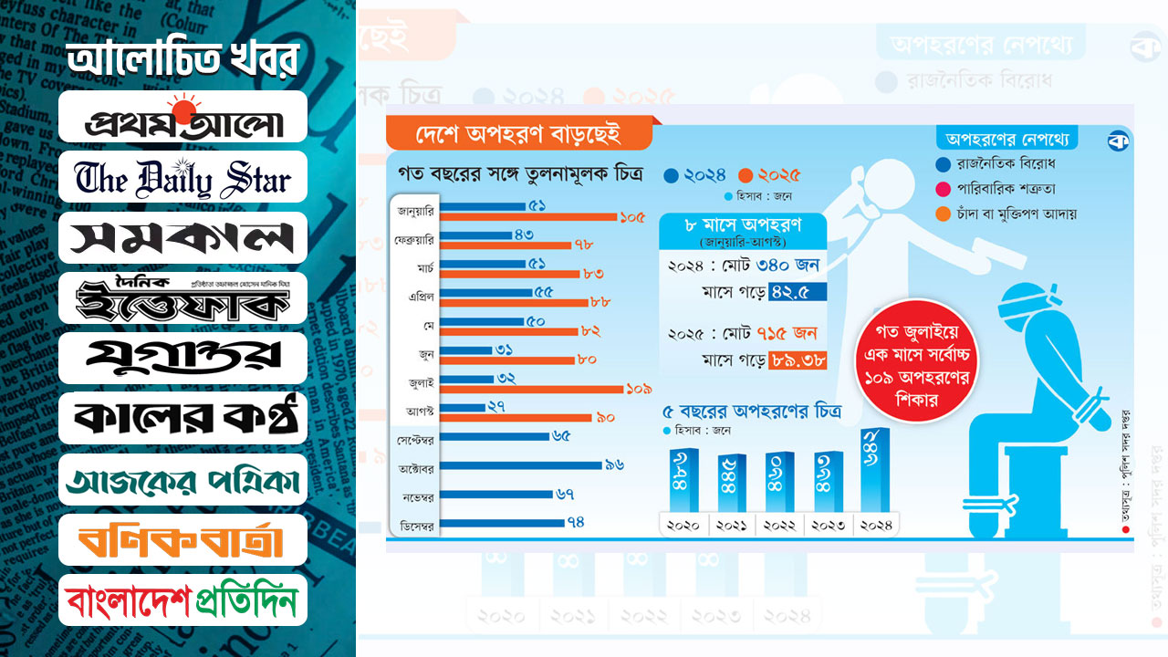 দেশে অপহরণসংক্রান্ত অপরাধের হার উদ্বেগজনকভাবে বাড়ছে। গত এক বছরে এই হার দ্বিগুণের বেশি। চলতি বছরের জানুয়ারি থেকে আগস্ট পর্যন্ত আট মাসে অপহরণের শিকার হয়েছে ৭১৫ জন। গত বছর এই একই সময়ে এই সংখ্যা ছিল ৩৪০।
