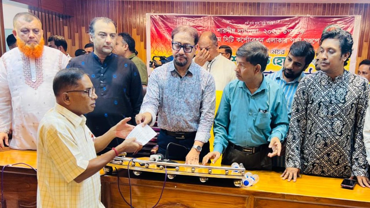 এ সময় নগরীর জে এম সেন হলের পূজামণ্ডপে ৫ লাখ টাকা এবং আরও ২৬৯টি পূজা মণ্ডপের প্রতিটির জন্য ৫ হাজার টাকা করে অনুদান দেওয়া হয়। পূজা মণ্ডপগুলোর সভাপতি ও সাধারণ সম্পাদকদের হাতে অনুদানের চেক তুলে দেন মেয়র।
