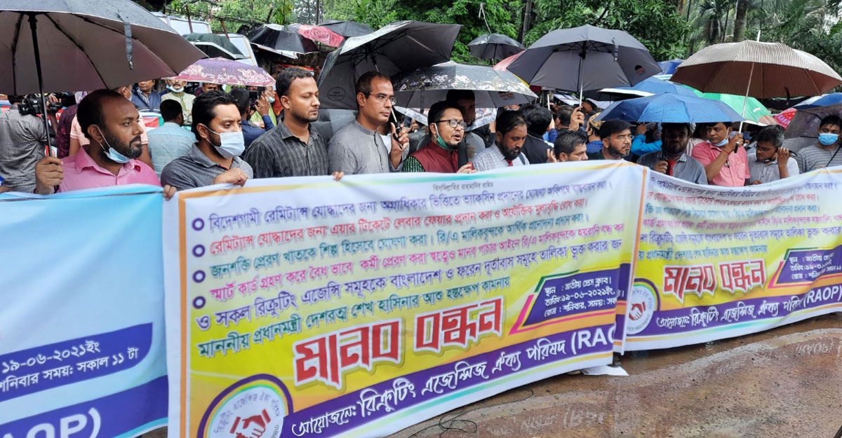 মানববন্ধনে বক্তারা বলেন, সৌদিসহ আরব দেশগুলোর এয়ার টিকিটের মূল্য বাংলাদেশ বিমানসহ বিভিন্ন এয়ারলাইন্স অযৌক্তিকভাবে তিন-চার গুণ বাড়িয়েছে। দেশের হাজার হাজার কোটি ডলার কষ্টার্জিত বৈদেশিক মুদ্রা বিদেশি এয়ারলাইন্স দেশ থেকে নিয়ে যাচ্ছে। ভারত, পাকিস্তান, নেপাল, শ্রীলঙ্কা থেকে ১৮/২২ হাজার টাকায় আরব দেশগুলোর এয়ার টিকেট মূল্য হলেও বাংলাদেশ থেকে একই গন্তব্যে এয়ার টিকিটের মূল্য ৭০/৯০ হাজার টাকা। অন্যদিকে ১৯৭৬ সাল থেকে আজ পর্যন্ত প্রায় এক কোটি ৩৩ লাখের বেশি নারী-পুরুষ রেমিট্যান্স যোদ্ধা বিশ্বের বিভিন্ন দেশে বৈধভাবে কর্মসংস্থানের সুযোগ পেয়েছে। এক কোটির বেশি রেমিট্যান্স যোদ্ধার কর্মসংস্থান সৃষ্টিতে রিক্রুটিং এজেন্সিগুলোর অবদান অসামান্য। বর্তমানে করোনা মহামারির কারণে জনশক্তি প্রেরণ খাত তথা রিক্রুটিং এজেন্সিগুলো শত শত কোটি টাকা আর্থিক ক্ষতিতে পড়েছে।