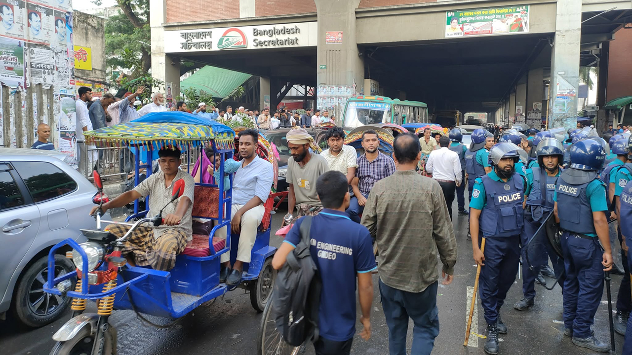 মূল বেতনের ২০ শতাংশ বাড়িভাড়া ও চিকিৎসা ভাতা বৃদ্ধির দাবিতে জাতীয় প্রেসক্লাবের সামনে লাগাতার অবস্থান কর্মসূচি পালন করা বেসরকারি শিক্ষাপ্রতিষ্ঠানের এমপিওভুক্ত শিক্ষকরা। পুলিশ তাদের সরিয়ে দিলে প্রেসক্লাবের যান চলাচল স্বাভাবিক হয়েছে।