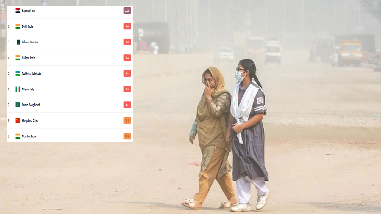 একই সময়ে দূষিত বায়ুর শহরগুলোর তালিকায় প্রথম ও দ্বিতীয় স্থানে ছিল ইরাকের বাগদাদ ও ভারতের দিল্লি। শহর দুটির স্কোর যথাক্রমে ২২৭৮ ও ১৯০। স্কোর ১৮৩ নিয়ে তৃতীয় অবস্থানে আছে পাকিস্তানের লাহোর, চতুর্থ অবস্থানে আছে কলকাতা, স্কোর ১৬৮ এবং ১৬৩ স্কোর নিয়ে পঞ্চম অবস্থানে আছে উজবেকিস্তানের তাশকেন্ট।