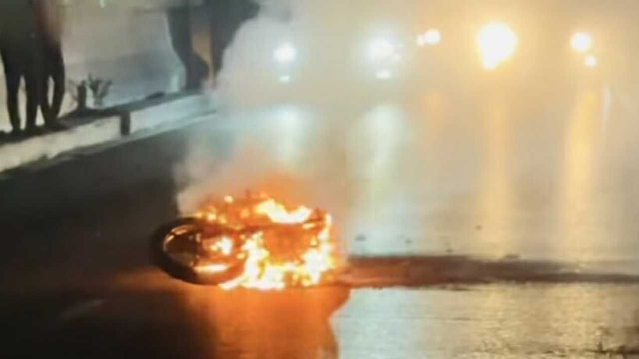 বিমানবন্দরের সামনে ফ্লাইওভারের উপরে মোটরসাইকেলে আগুন