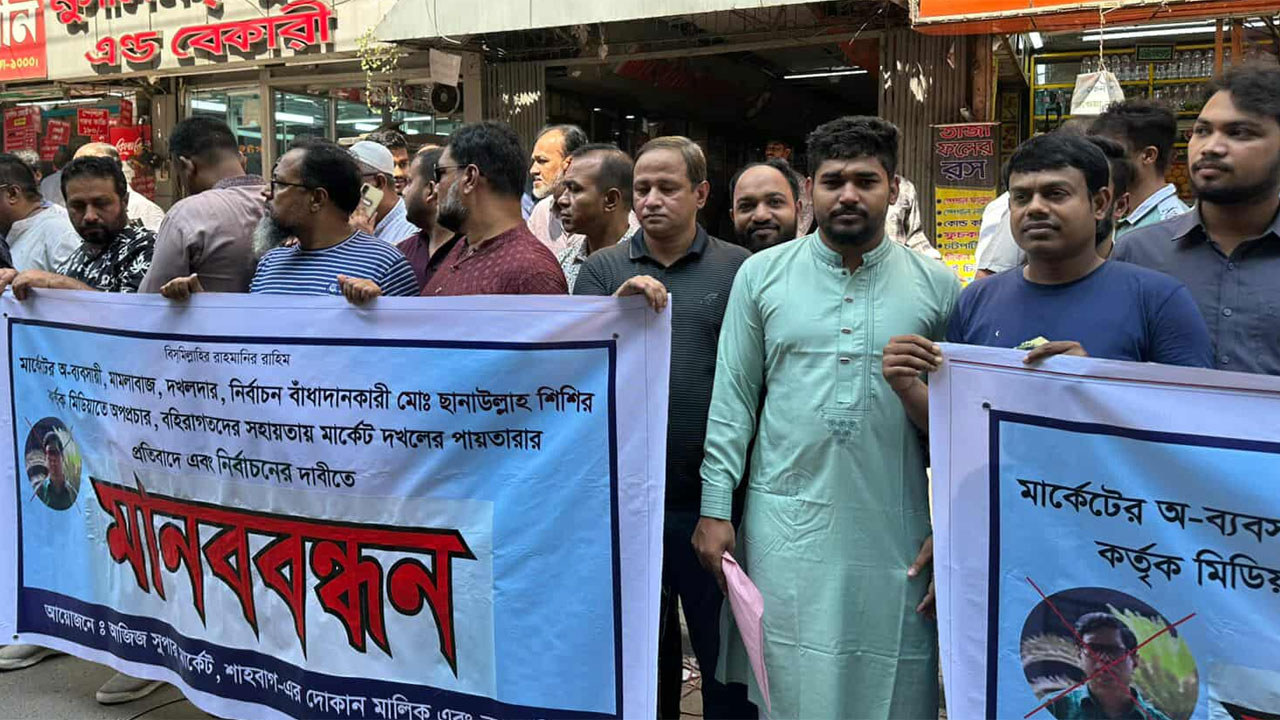 রাজধানীর শাহবাগের আজিজ সুপার মার্কেটে নির্বাচন আয়োজন ও মার্কেট দখলচেষ্টার প্রতিবাদে মানববন্ধন করেছে দোকান মালিক ও ব্যবসায়ীরা।