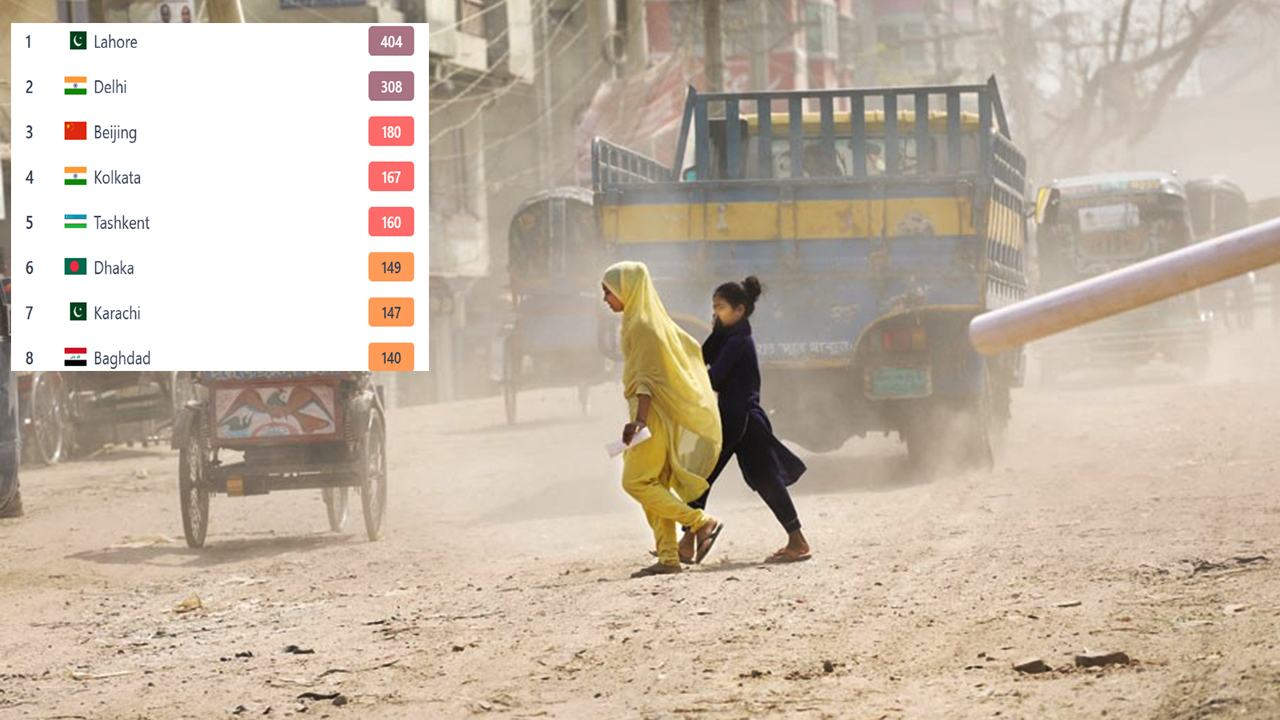 আইকিউএয়ারের দেওয়া তথ্যে দেখা যায়, বিশ্বের দূষিত শহরগুলোর তালিকায় শীর্ষে রয়েছে পাকিস্তানের লাহোর। ৪০৪ একিউআই স্কোর শহরটির বাতাসের মান ‘বিপজ্জনক’ পর্যায়ে রয়েছে। এদিকে দ্বিতীয় স্থানে রয়েছে ভারতের দুই শহর দিল্লি, স্কোর ৩০৮। তৃতীয় স্থানে রয়েছে চীনের বেইজিন, যার স্কোর ১৮০। ১৬৭ স্কোর নিয়ে চতুর্থ স্থানে রয়েছে ভারতের কলকাতা।