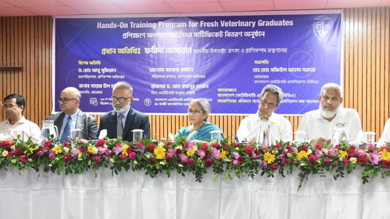 শনিবার (২৫ অক্টোবর) বিকেলে বাংলাদেশ ভেটেরিনারি কাউন্সিল অডিটোরিয়ামে নবীন ভেটেরিনারি গ্র্যাজুয়েটদের জন্য আয়োজিত হ্যান্ডস-অন ট্রেনিং প্রোগ্রাম ফর ফ্রেশ ভেটেরিনারি গ্র্যাজুয়েটস-এর সার্টিফিকেট বিতরণ অনুষ্ঠানে প্রধান অতিথির বক্তৃতায় তিনি এসব কথা বলেন।