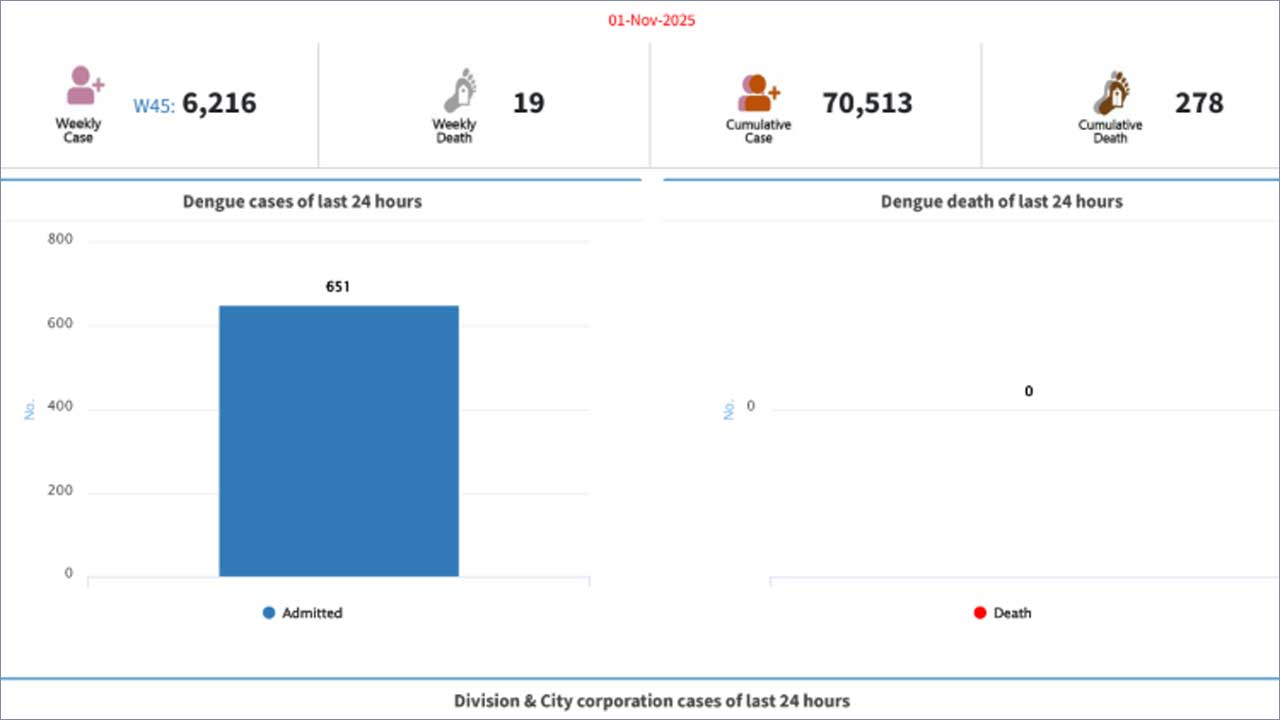 স্বাস্থ্য অধিদপ্তর জানিয়েছে, এ বছরের জানুয়ারি থেকে এখন পর্যন্ত সবমিলিয়ে ৭০ হাজার ৫১৩ জন রোগী হাসপাতালে ভর্তি হয়েছেন। বছরের এখন পর্যন্ত ডেঙ্গুতে মৃত্যু হয়েছে ২৭৮ জনের।