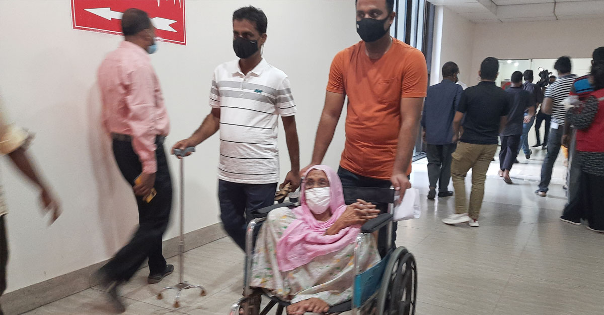 সোমবার (২১ জুন) দুপুরের দিকে রাজধানীর কুর্মিটোলা জেনারেল হাসপাতালে ১০০ বছর বয়সী নুরুন্নাহার বেগমকে টিকা নিতে দেখা যায়। ছেলে ও নাতির সঙ্গে তিনি এ হাসপাতালে টিকা নিতে আসেন।