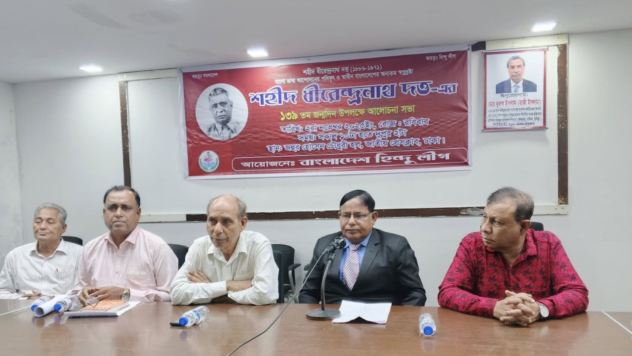 রোববার (২ নভেম্বর) জাতীয় প্রেসক্লাবে বাংলাদেশ হিন্দু লীগ আয়োজিত ভাষা সৈনিক ও স্বাধীন বাংলার অন্যতম স্বপ্নদ্রষ্টা শহীদ ধীরেন্দ্রনাথ দত্তের ১৩৯তম জন্মবার্ষিকী উপলক্ষ্যে আয়োজিত আলোচনা সভায় এসব কথা বলেন বাংলাদেশ হিন্দু মহাসভার সভাপতি বীর মুক্তিযোদ্ধা দীপক চন্দ্র গুপ্ত।