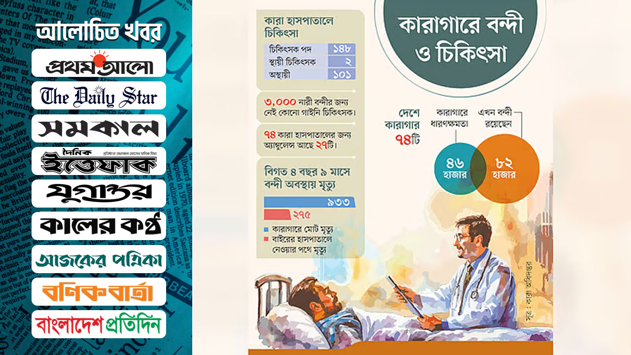 দেশের ৭৪টি কারাগারে বন্দীর সংখ্যা প্রায় ৮২ হাজার। কিন্তু তাঁদের জন্য স্থায়ী চিকিৎসক রয়েছেন মাত্র দুজন। অভিযোগ রয়েছে, চিকিৎসকের অভাবসহ নানা সংকট ও অব্যবস্থাপনায় যথাযথ চিকিৎসা পান না অসুস্থ বন্দীরা।