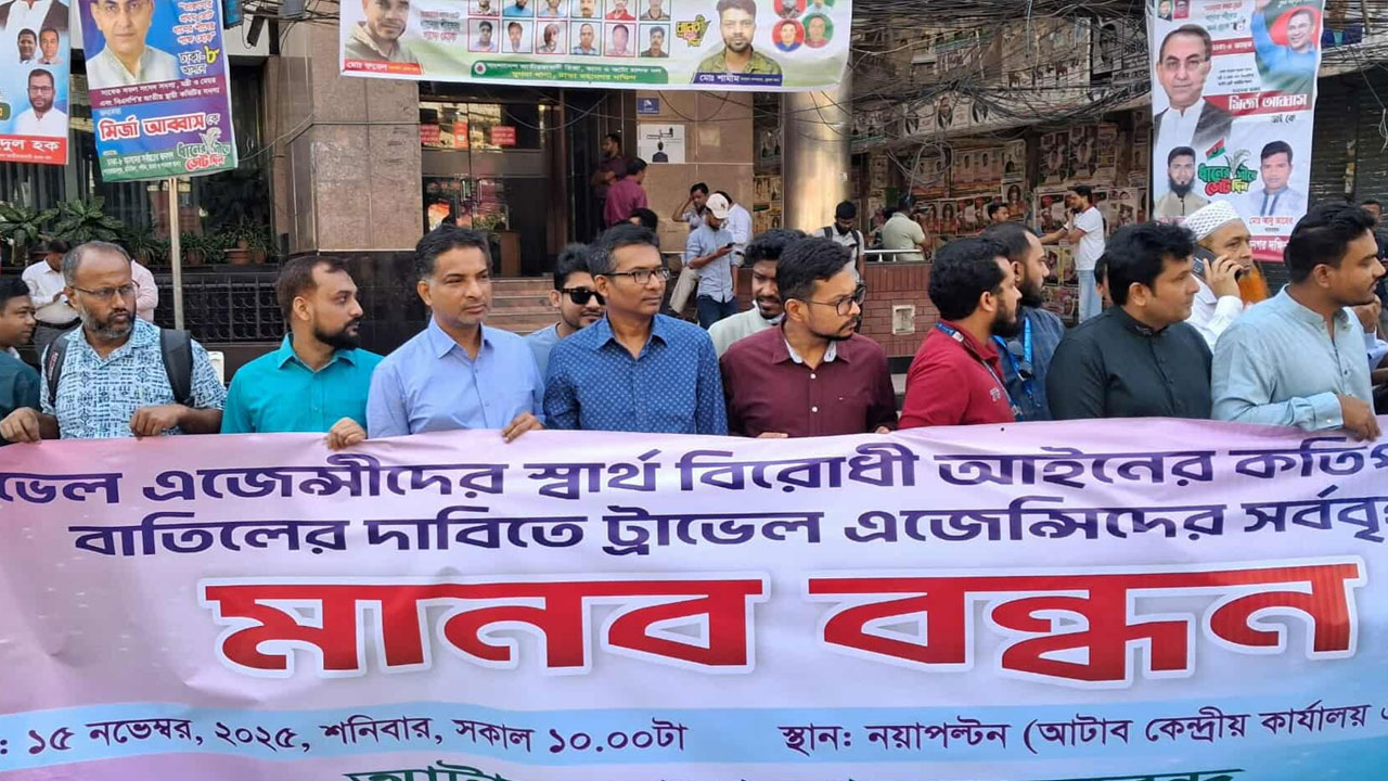 শনিবার (১৫ নভেম্বর) রাজধানীর নয়া পল্টনে হোটেল ভিক্টরির সামনে এক মানববন্ধন থেকে এসব দাবি জানায় অ্যাসোসিয়েশন অব ট্রাভেল এজেন্টস অব বাংলাদেশের (আটাব) সদস্যরা।