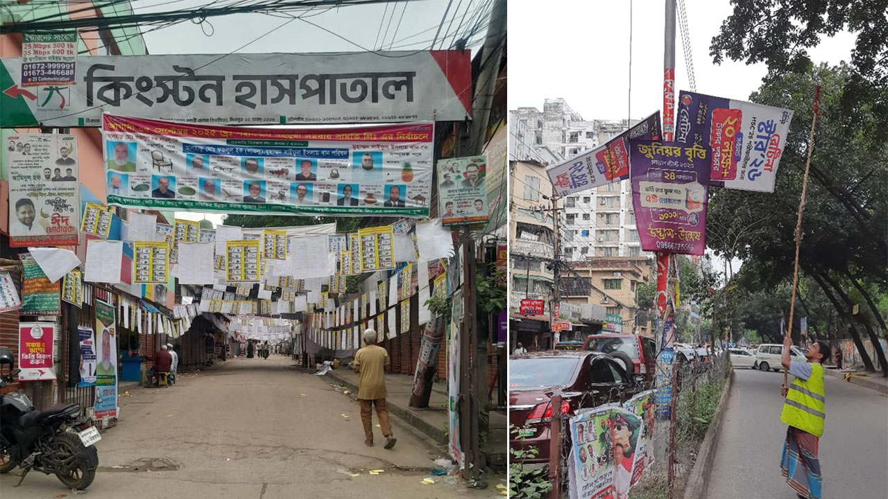 শহর যেন নিজের রঙ হারিয়ে রাজনৈতিক প্রচারণা, ব্যবসায়িক বিজ্ঞাপন আর ব্যক্তিগত প্রচারনার স্তূপে ঢাকা পড়ে গেছে। শহরের আকাশ দিনে দিনে ছেয়ে গেছে রঙিন কাপড়, প্লাস্টিক আর কাগজের ভিড়ে। প্রধান সড়ক থেকে শুরু করে অলিগলি—যেখানে তাকানো যায়, সেখানেই দুলছে ব্যানার, ফেস্টুন ও নানা রঙের পোস্টার। রাজধানী এক বিশাল প্রচারণা-প্রদর্শনীতে ঢেকে শহরের নিজস্ব সৌন্দর্যের হারানোর মধ্যে দিয়ে ঢাকা যেন ঢাকা পড়েছে।