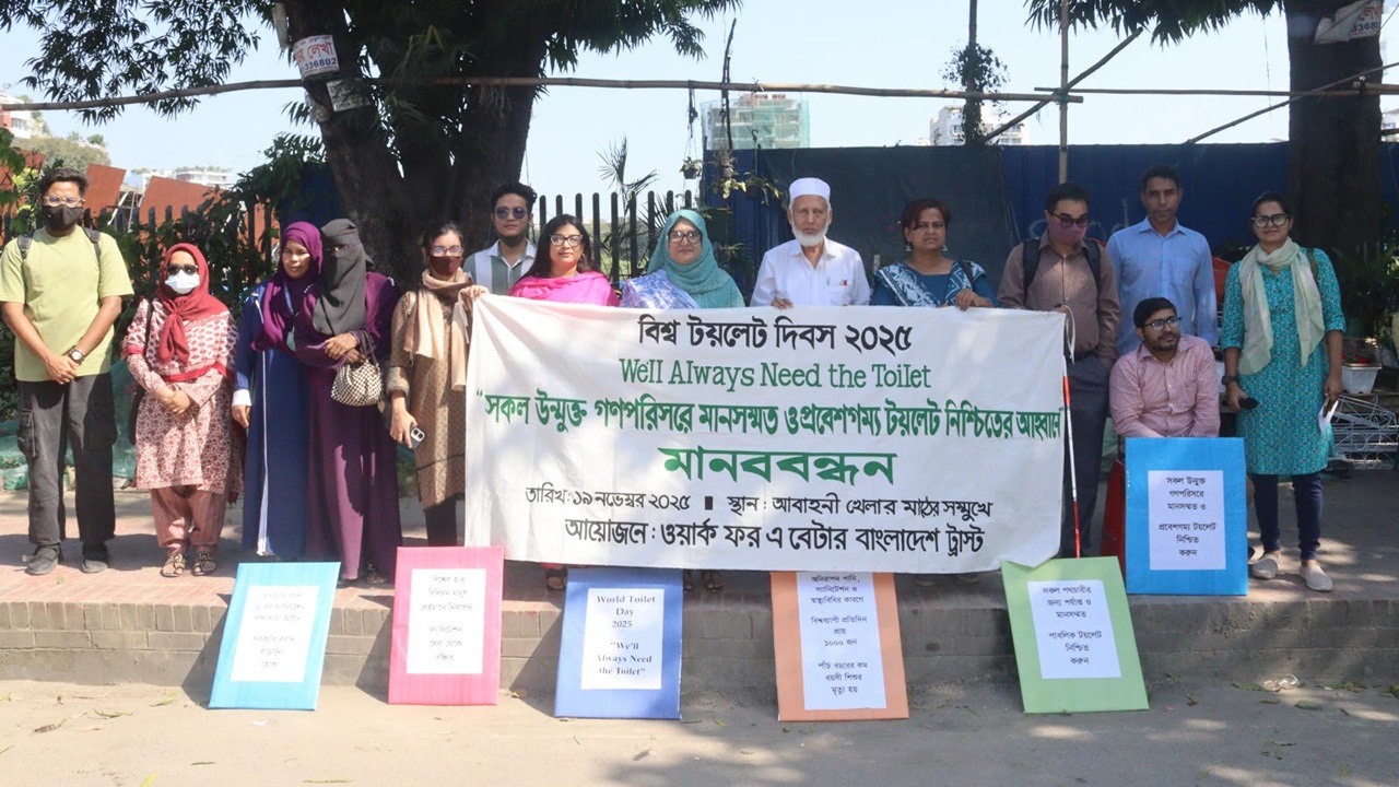 বুধবার (১৯ নভেম্বর) ধানমন্ডি সাত মসজিদ সড়কে আবাহনী খেলার মাঠের সামনে ইনস্টিটিউট অব ওয়েলবিইং বাংলাদেশ, এবং ওয়ার্ক ফর এ বেটার বাংলাদেশ ট্রাস্ট-এর যৌথ উদ্যোগে আয়োজিত “সকল উন্মুক্ত গণপরিসরে মানসম্মত ও প্রবেশগম্য টয়লেট নিশ্চিতের আহ্বানে” শীর্ষক মানববন্ধন থেকে বক্তারা এসব কথা বলেন।
