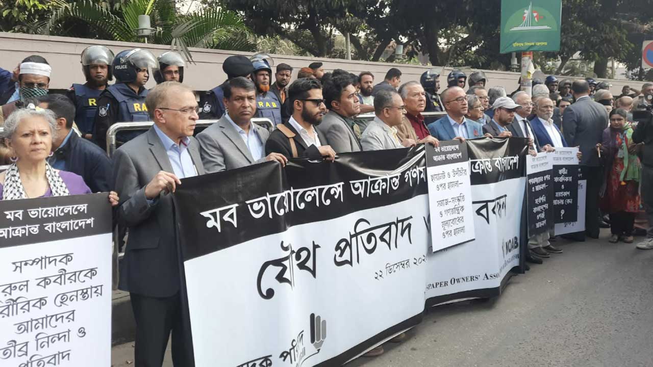 ‘মব ভায়োলেন্সে আক্রান্ত বাংলাদেশ’ শীর্ষক যৌথ এই প্রতিবাদ সভার আয়োজন করে সংবাদপত্রের সম্পাদকদের সংগঠন সম্পাদক পরিষদ ও মালিকদের সংগঠন নিউজ পেপার ওনার্স অ্যাসোসিয়েশন (নোয়াব)। প্রতিবাদ সভায় বিভিন্ন রাজনৈতিক দলের নেতা, পেশাজীবী সংগঠন, ব্যবসায়ী সংগঠন, সাংবাদিক সংগঠন ও নাগরিক সমাজের প্রতিনিধিসহ বিভিন্ন শ্রেণি-পেশার মানুষ সংহতি জানাতে আসেন। প্রতিবাদ সভা শেষে প্যান প্যাসিফিক সোনারগাঁওয়ের পাশের রাস্তায় দাঁড়িয়ে মানববন্ধন করেন তারা।