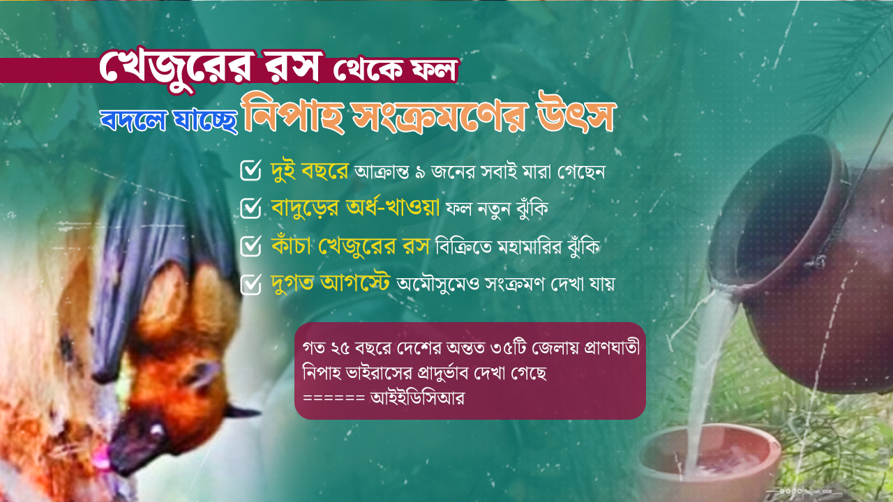 তিনি বলেন, ‘এতদিন বাদুড় থেকে মানুষের সংক্রমণের প্রধান উৎস ছিল কাঁচা খেজুরের রস বা গাছতলায় পড়ে থাকা অর্ধ-খাওয়া ফল। কিন্তু মা-শিশু সংক্রমণ দেখাচ্ছে, পরিবারকেন্দ্রিক ছড়ানোর ঝুঁকি তৈরি হচ্ছে। শিশুদের রোগ প্রতিরোধ ব্যবস্থা পূর্ণ পরিপক্ব নয়, তাই তাদের ঝুঁকি অন্যান্যদের তুলনায় অনেক বেশি।’