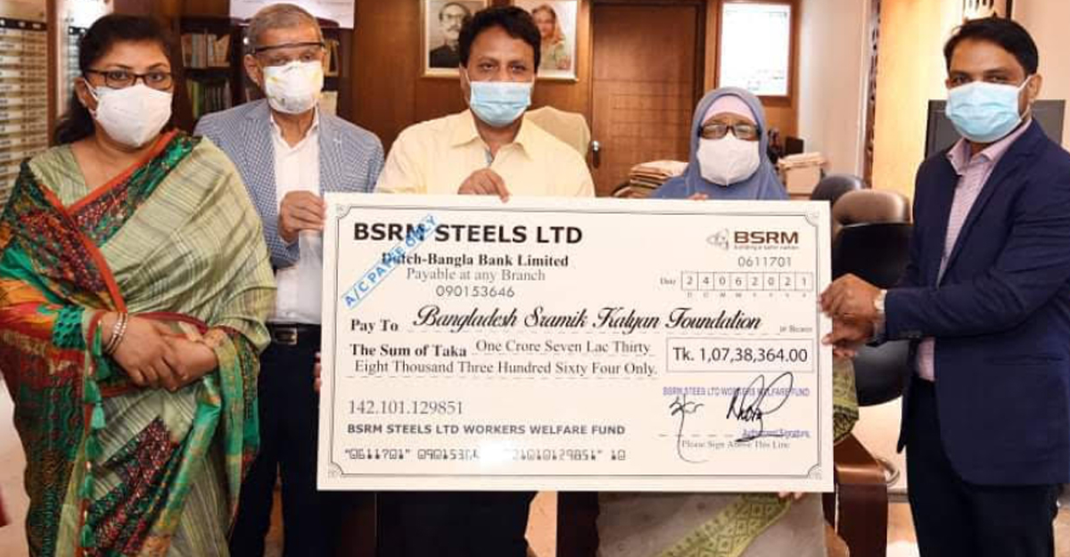 বাংলাদেশ শ্রমিক কল্যাণ ফাউন্ডেশনের তহবিলে ৫ কোটি ১১ লাখ টাকা লভ্যাংশ জমা দিয়েছে স্টিল রি-রোলিং মিলস-বিএসআরএম এবং শীর্ষ স্থানীয় মোবাইল অবকাঠামো নির্মাণ কোম্পানি ইডটকো বাংলাদেশ।
