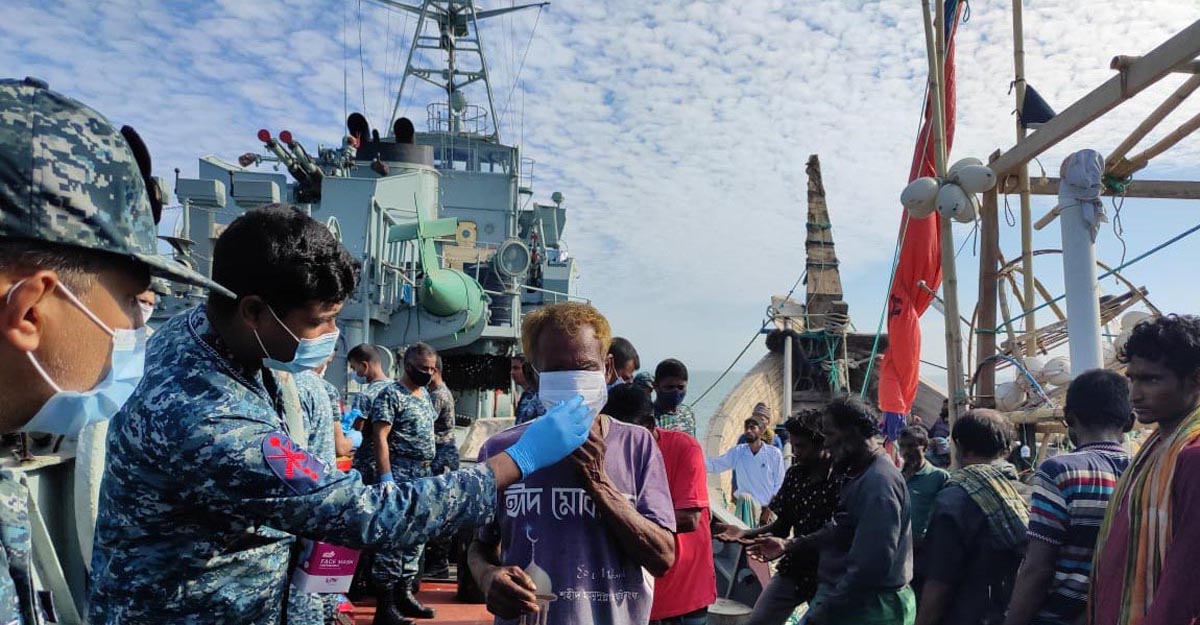 সংবাদ বিজ্ঞপ্তিতে জানানো হয়েছে, নৌবাহিনীর জাহাজ ‘নির্মূল’ ও ‘অতন্দ্র’ গভীর সমুদ্রে টহলরত অবস্থায় ফিশিং বোটটিকে দেখতে পায়। পরে উদ্ধার করে। তীব্র পানি ও খাদ্য সংকটে শারীরিক ও মানসিকভাবে দুর্বল হয়ে পড়েছিলেন জেলেরা। নৌবাহিনী তাদের উদ্ধার করে প্রাথমিক চিকিৎসা, প্রয়োজনীয় খাদ্য ও বস্ত্র দেয়। পরে নৌকাটির ইঞ্জিন মেরামত করে। এরপর নৌকা ও মাঝিদেরকে নিরাপদে পটুয়াখালীতে পাঠানোর জন্য নৌবাহিনীর সেন্টমার্টিন ঘাঁটিতে হস্তান্তর করা হয়।