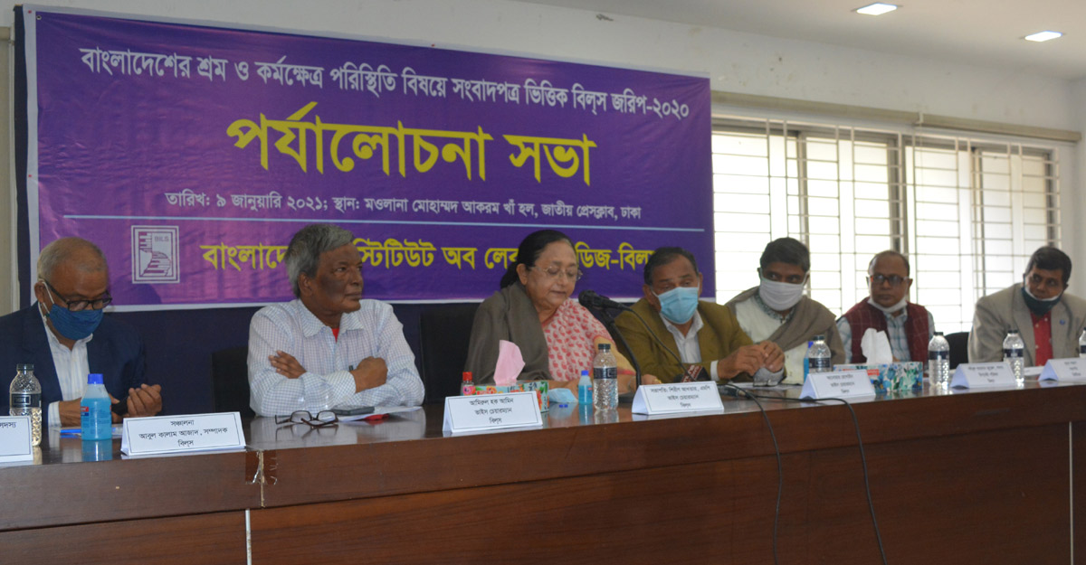 শনিবার (৯ জানুয়ারি) জাতীয় প্রেসক্লাবে বাংলাদেশ ইনস্টিটিউট অব লেবার স্টাডিজ বিলসের উদ্যোগে “বাংলাদেশের শ্রম ও কর্মক্ষেত্র পরিস্থিতি বিষয়ে সংবাদপত্র ভিত্তিক বিলস্ জরিপ ২০২০” শীর্ষক এক পর্যালোচনা সভায় এ চিত্র তুলে ধরা হয়।