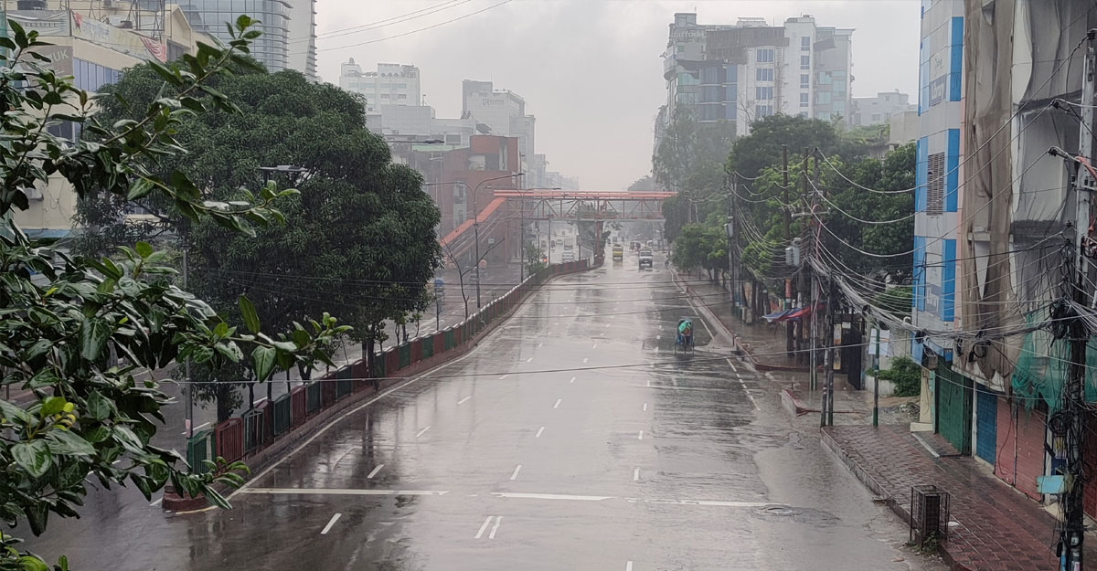 ছুটির দিন, কঠোর লকডাউন এবং টিপটিপ বৃষ্টি, তিনে মিলে জনশূন্য রাজধানীর প্রধান সড়কগুলো। করোনাভাইরাসের সংক্রমণ রোধে সরকার ঘোষিত কঠোর লকডাউনের দ্বিতীয় দিনে সড়কে নেই সাধারণ মানুষের চলাচল। মানুষ আর যানবাহনের কোলাহলপূর্ণ সড়কে বিরাজ করছে সুনসান নীরবতা।