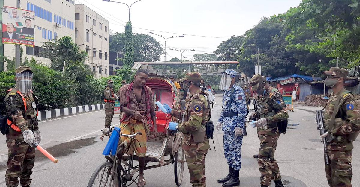 লকডাউনের দ্বিতীয় দিনে আজ (শুক্রবার) রাজধানীর প্রধান সড়ক ছিল ফাঁকা। শাহবাগে চেকপোস্ট বসিয়ে সড়কে চলাচলকারীদের জিজ্ঞাসাবাদ করছে সেনাবাহিনীর একটি দল। শুক্রবার (২ জুলাই) দুপুর আড়াইটা থেকে আধা ঘণ্টা স্থায়ী চেকপোস্টে নির্দেশনা অমান্যকারীদের শাস্তির দেওয়ার পরিবর্তে সচেতনতায় বেশি সক্রিয় দেখা গেছে সেনাবাহিনীকে।