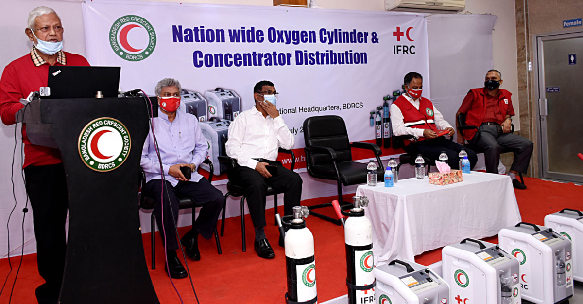 দেশে করোনা প্রতিরোধ কার্যক্রমকে গতিশীল করতে বাংলাদেশ রেড ক্রিসেন্ট সোসাইটি ৬৪০টি অক্সিজেন সিলিন্ডার ও ২০০টি বিশেষ অক্সিজেন কনসেন্ট্রেটর সোসাইটির ৬৪ জেলা ইউনিট, ৪টি সিটি ইউনিট, ৫৬টি এমসিএইচ ও ৫টি জেনারেল হাসপাতালে বিতরণ করেছে।