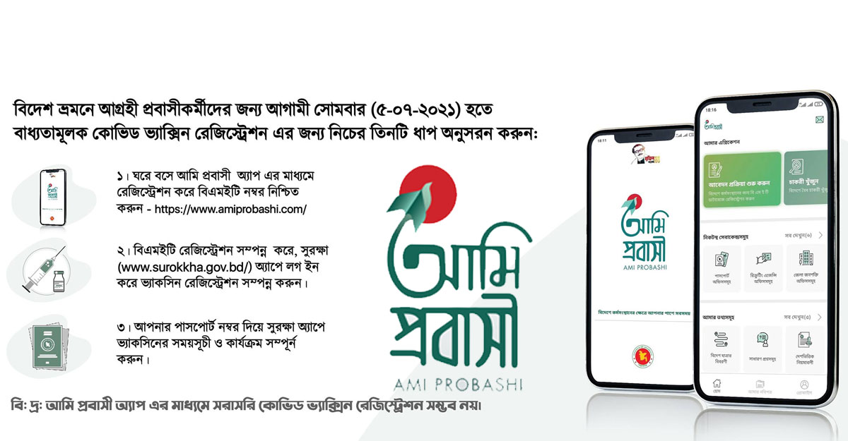 বিজ্ঞপ্তিতে আরও জানানো হয়, টিকা নিবন্ধনের জন্য সুরক্ষার পাশাপাশি আমি প্রবাসী অ্যাপে নিবন্ধনের প্রয়োজনীয়তা সম্পর্কে প্রবাসী কল্যাণ ও বৈদেশিক কর্মসংস্থান মন্ত্রী ইমরান আহমদ এবং বিএমইটির মহাপরিচালক শহীদুল আলম জানিয়েছেন, দেশে পাসপোর্টধারী কোটি মানুষ আছেন। তাদের মধ্যে কারা বিদেশে কাজ করতে যাচ্ছেন সেটি বিএমইটির নিবন্ধন ছাড়া নিশ্চিত করা সম্ভব নয়। সে কারণেই এই নিবন্ধন। আমি প্রবাসী অ্যাপের মাধ্যমে ঘরে বসেই সেই কাজটি হচ্ছে।