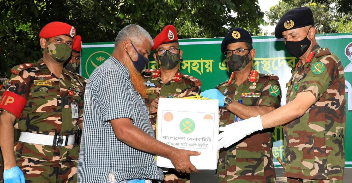 আন্তঃবাহিনী জনসংযোগ পরিদফতর (আইএসপিআর) থেকে পাঠানো এক সংবাদ বিজ্ঞপ্তিতে জানানো হয়, সেনাবাহিনী প্রধানের দিকনির্দেশনায় কর্মহীন গরীব, অসহায় ও দুস্থ মানুষের মধ্যে এসব ত্রাণ বিতরণ করা হয়।