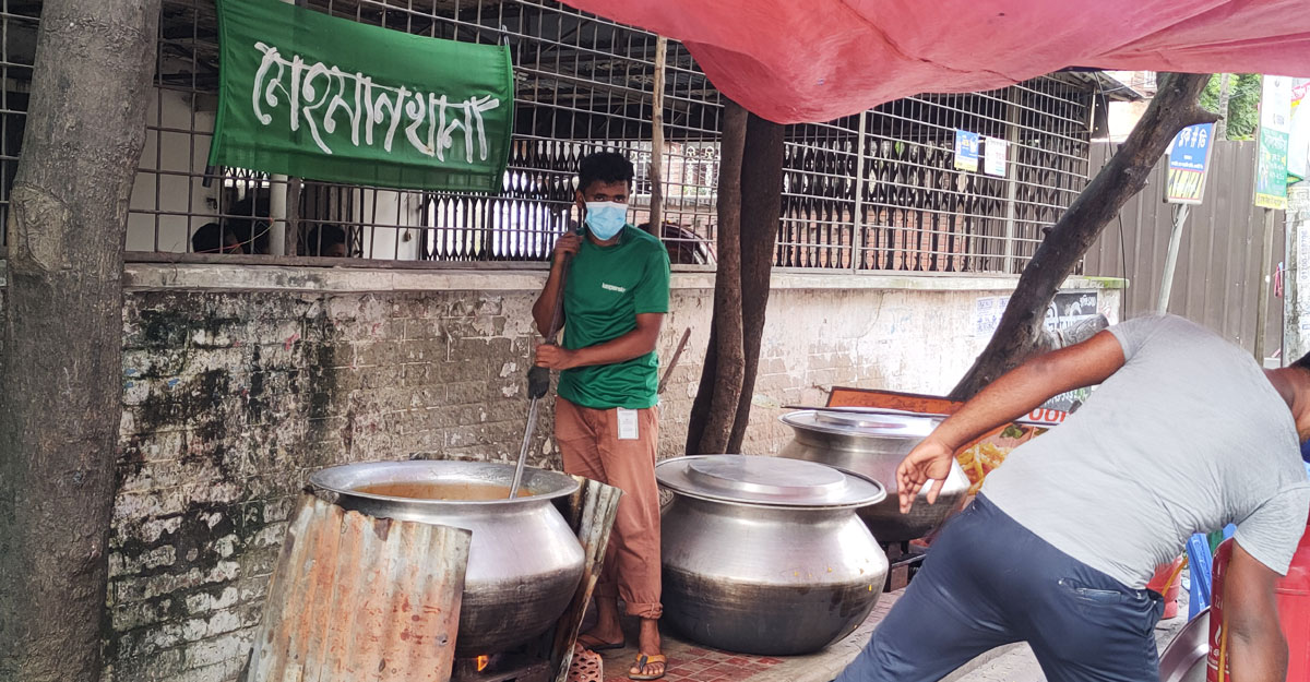 রোববার (১১ জুলাই) রাজধানীর মোহাম্মদপুরের লালমাটিয়া আবাসিক এলাকার ডি ব্লকে মেহমানখানার এমন বিশাল কর্মযজ্ঞ চোখে পড়ে। সরেজমিনে ঘুরে দেখা যায়, বিকেল ৫টা থেকে আসতে শুরু করেন মানুষজন। রিকশাচালক, পথচারী, দিনমজুর, দারোয়ান, নির্মাণ শ্রমিক, পথশিশুসহ অসংখ্য মেহমানের পদচারণায় সন্ধ্যার আগেই মুখরিত হয়ে ওঠে পুরো এলাকা। সন্ধ্যা ৬টা থেকেই শুরু হয় খাবার বিতরণ। সারিবদ্ধভাবে রাস্তার দু’পাশে রিকশা দাঁড় করিয়ে খাবারের প্লেট নিয়ে আয়েশ করে ফুটপাতেই খেতে বসেন তারা। খাবার বিতরণ করা হয় দুটি বুথ থেকে। একটিতে তাৎক্ষণিক খাওয়ার জন্য, অপরটিতে বাড়ি নিয়ে যাওয়ার জন্য খাবার সরবরাহ করা হয়। যারা খাবার বাড়িতে নিয়ে যেতে চান তারা স্বেচ্ছাসেবীদের পরিবারের সদস্যের সংখ্যা বললেই সেই মতো খাবার দিয়ে দেওয়া হয়।