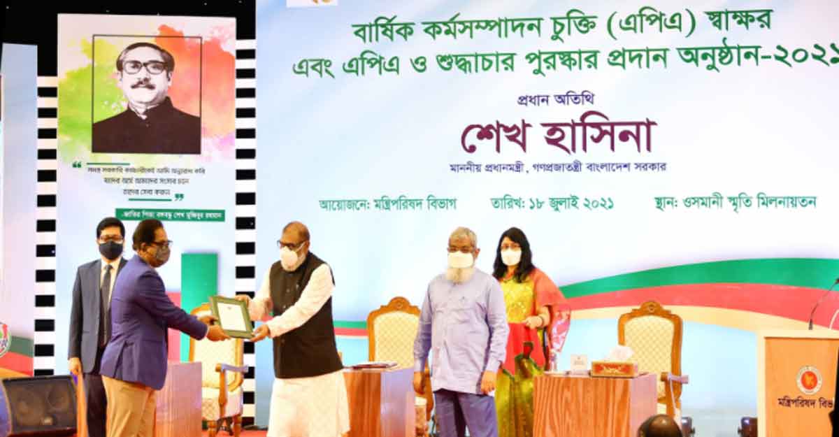 রোববার (১৮ জুলাই) ওসমানী স্মৃতি মিলনায়তনে মন্ত্রণালয় ও বিভাগগুলোর বার্ষিক কর্মসম্পাদন চুক্তি স্বাক্ষর এবং এপিএ ও শুদ্ধাচার পুরস্কার প্রদান অনুষ্ঠানে এ সম্মাননা দেওয়া হয়। অনুষ্ঠানে প্রধানমন্ত্রী শেখ হাসিনা ভার্চুয়ালি যুক্ত ছিলেন।