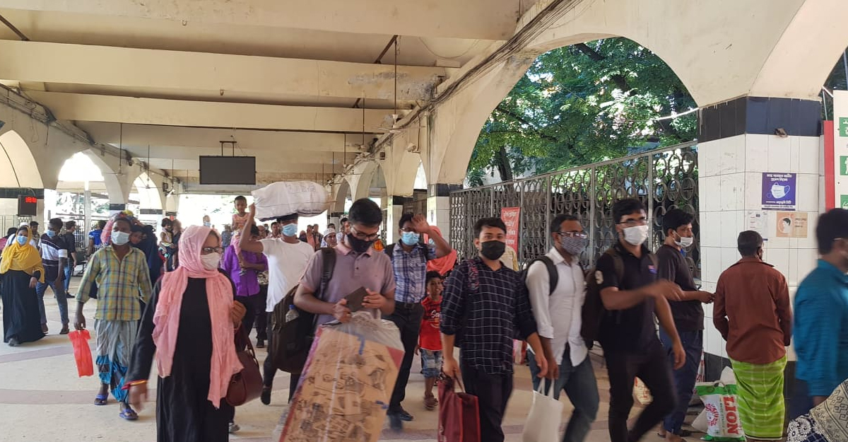 সরেজমিনে দেখা যায়, ঢাকামুখী প্রতিটি ট্রেন ফিরেছে যাত্রীভর্তি হয়ে। এসব ট্রেনে আসা যাত্রীদের মধ্যে স্বাস্থ্যবিধি খুব একটা দেখা যায়নি। ট্রেন থেকে নেমে প্লাটফর্ম দিয়ে হাঁটার সময় অনেকের মুখেই ছিল না মাস্ক।