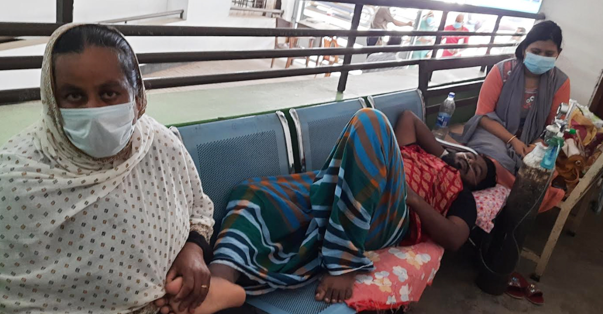 শয্যা না পেয়ে বারান্দায় রোগীকে অক্সিজেন দেওয়া হচ্ছে